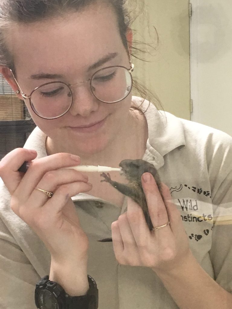 Intern Mary Kate Shaver feeds an orphaned baby squirrel. Mary Kate is studying Veterinary Science and Animal Ecology at Iowa State University.