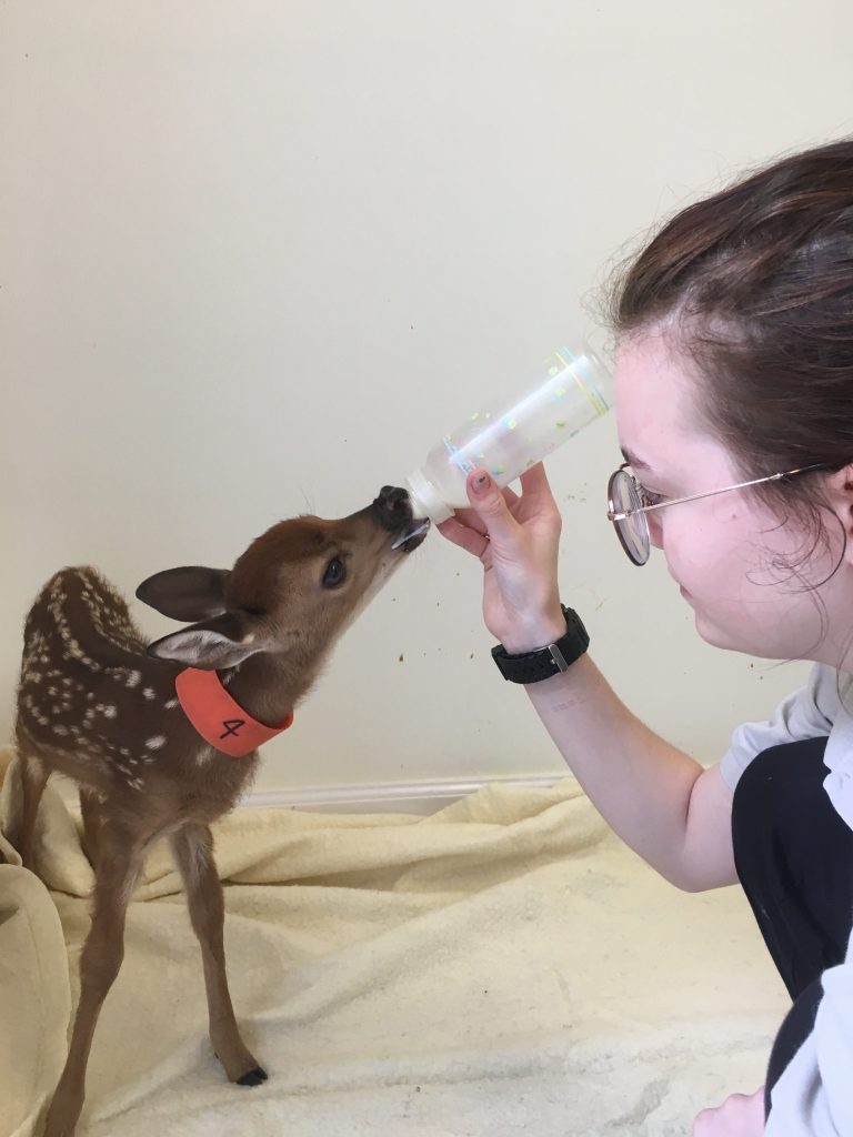Mary Kate feeds one of the orphaned fawns.