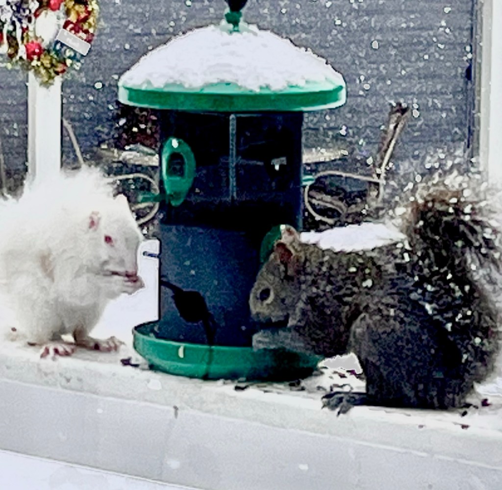 One day my grandson was visiting and as Whitey came into view I let out my usual whoop, “There’s Whitey the albino squirrel!” As we watched the creature hop through the yard a soft snow started falling, the kind that clumps together and comes down in gossamer softness. The boy turned to me.