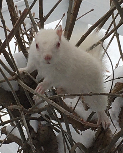 But I was wrong. About two weeks later I looked out my window one morning to see the animal peering in at me from a bush. Once again my heart leaped into my throat and I exclaimed out loud, “The albino squirrel!”