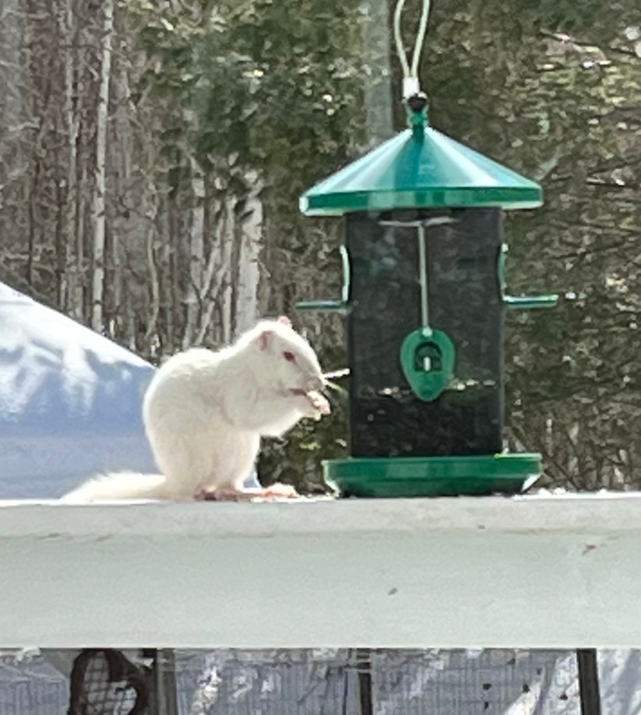 I normally don’t name wildlife that comes through my homestead unless some physical feature makes them stand out. For instance one summer I had a frequent gray squirrel with no tail….Stumpy.  For a few months one spring I had a big doe come in with half an ear missing…Half-Eared Edith. So as the albino squirrel sightings amped up I simply dubbed the animal, ‘Whitey.’